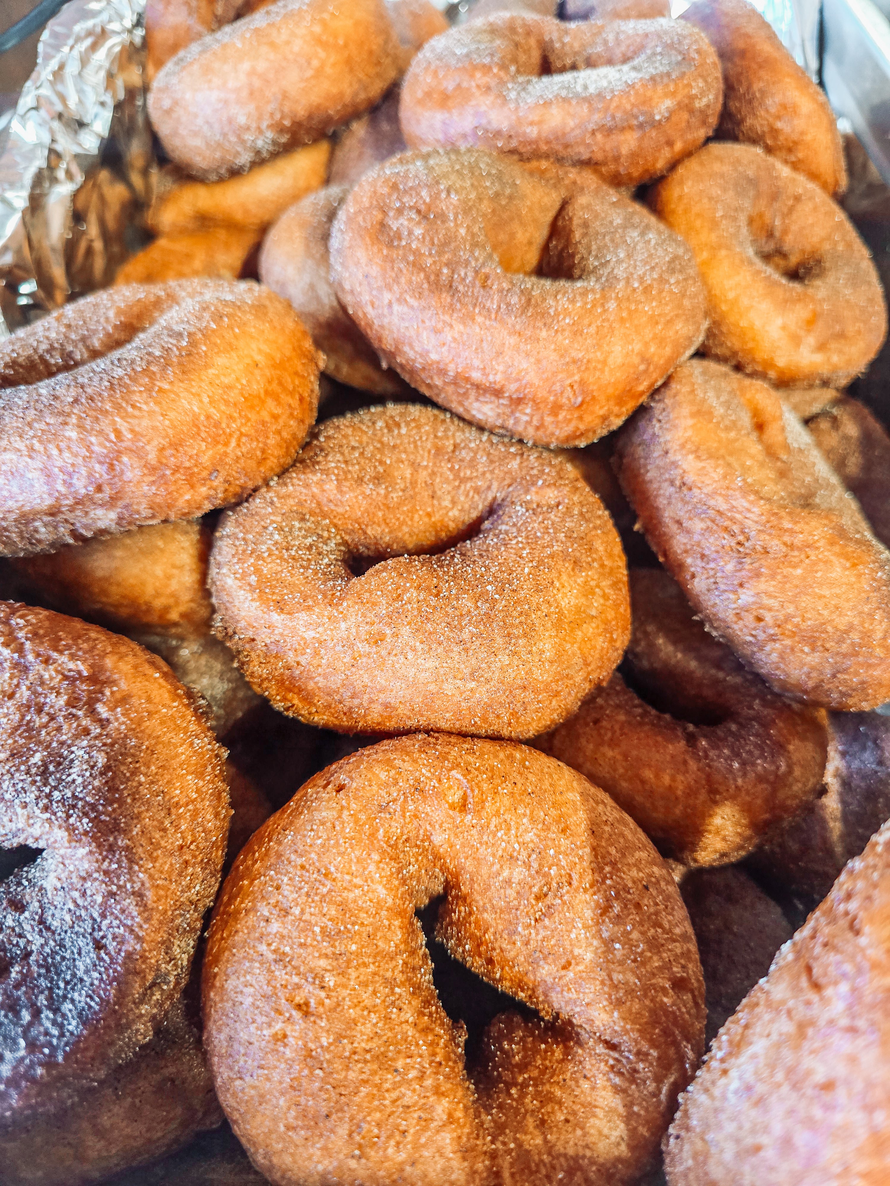 Come grab some homemade apple cider donuts! Each donut is sprinkled with cinnamon sugar when they come out hot!